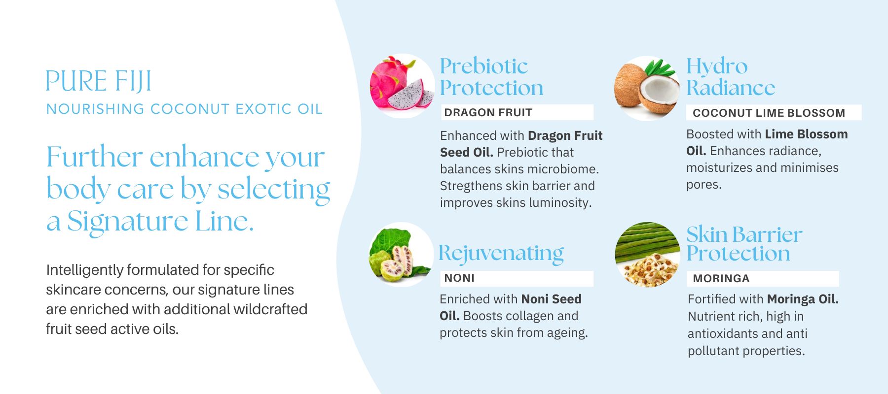Indulge in our award-winning Nourishing Exotic Coconut Oil - a balanced blend of wild-harvested seed oils for deeply hydrated, glowing, and subtly luminous skin. Cold-pressed Virgin Coconut, Dilo, Sikeci, and Macadamia oils create a unique bio network, allowing nutrients to be absorbed directly where their effects are needed. This multitasking oil nourishes and rejuvenates, promoting cellular renewal and protecting against environmental elements.